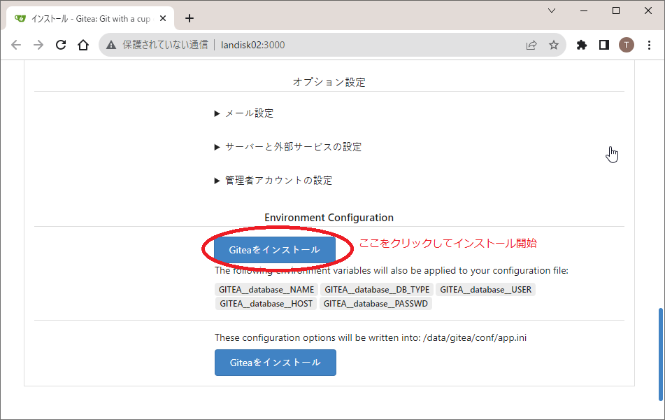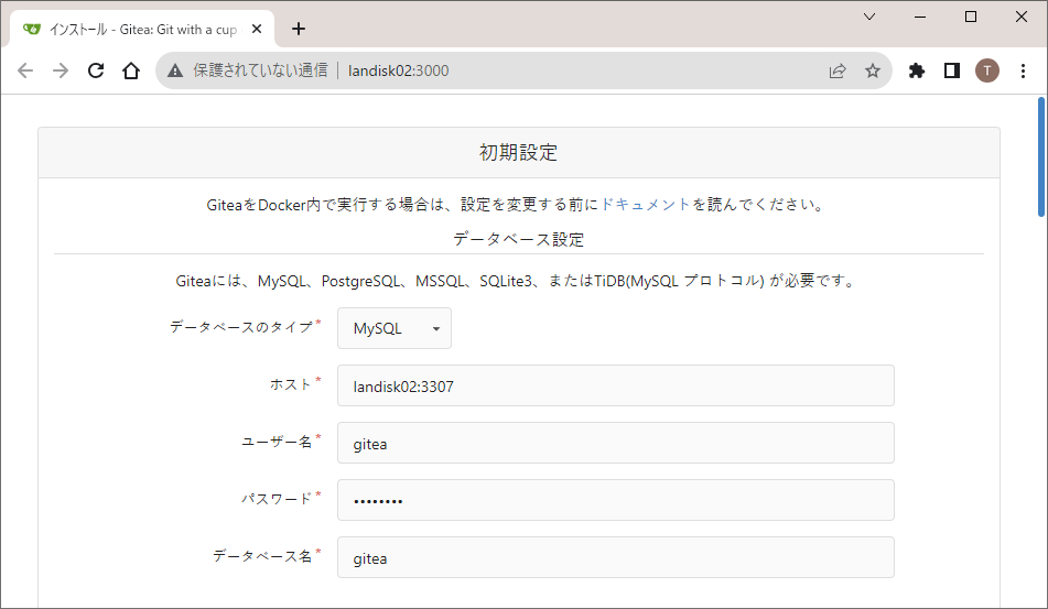 Web URLをクリックするとgitea初期設定画面が新しいブラウザ画面に表示されます。