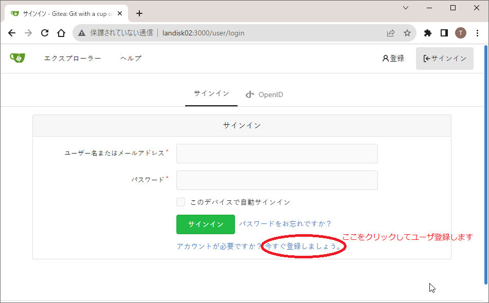 数秒後にはログイン画面が表示されます。上画面のオプション設定の[管理者アカウントの設定]を行わなければ、最初に登録したユーザが管理者になります。gitea公式URL情報。