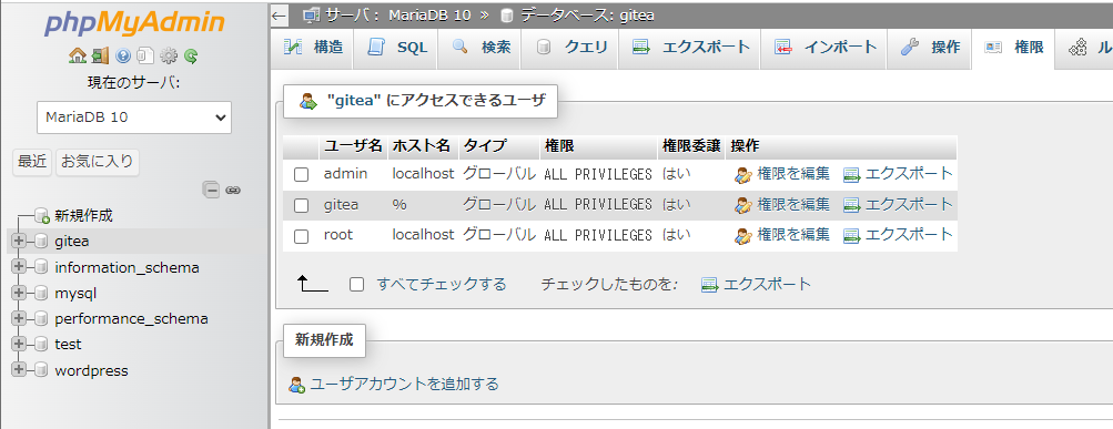 ログイン後、giteaで使用するデータベースとユーザを追加します。