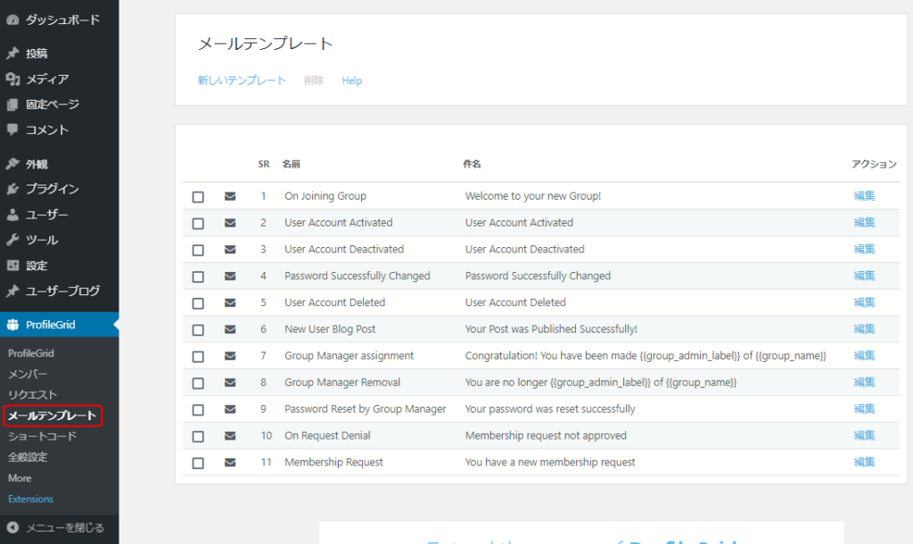 WordPressの左側メニューにProfileGridのメニューが日本語化されます。一番よく使うのが[全般設定]の各サブメニューです。各サブメニュー画面も日本語表示されます。メールテンプレートは残念ながら日本語になりませんが、英文書を翻訳しても全く使い物ならないです。全てのメールを使用しなかったので、使用するモノだけ書き換えましょう。