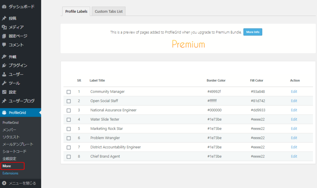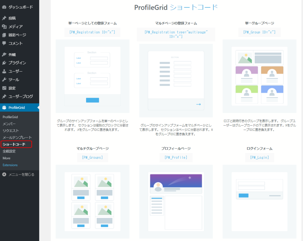 日本語化開始バージョン3.9.5の画面を下に貼り付けます。2022年7月14日現在、ProfileGridはバージョン4.9.7です。ショートコード画面が多数増えておりますが、ここでは割愛します。日本語化対応ファイルは4.9.7に対応しております。