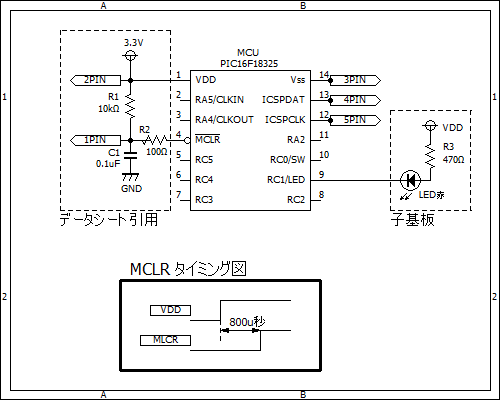 コンフィグを適用した基板(PIC16F18325)回路図は下図です。端子マーク1~5pinは、PICkit3のpin番号に接続する。